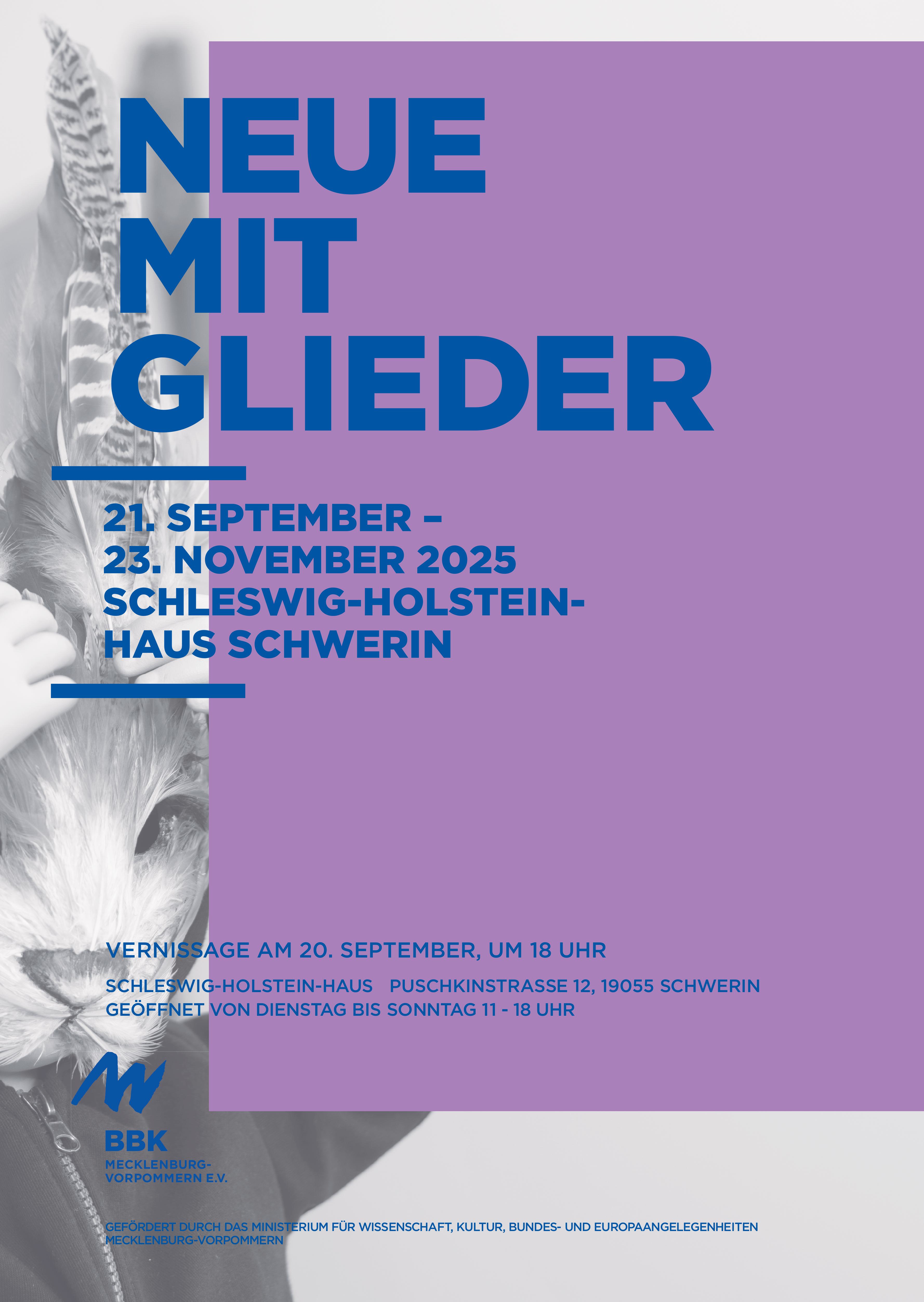 Der Berufsverband Bildender Künstlerinnen und Künstler Mecklenburg-Vorpommern e.V. (BBK M-V e.V.) begrüßt seine neuen Mitglieder 2025 mit der Ausstellung NEUE MITGLIEDER. Vom 21. September bis zum 23. November 2025 werden im Kulturforum Schleswig-Holstein-Haus in Schwerin zeitgenössische Arbeiten von 28 Künstlerinnen und Künstlern aus den Bereichen Malerei, Grafik, Zeichnung, Plastik, Fotografie, Video-, Medien- und Objektkunst zu sehen sein. Die einzelnen Ausstellungsräume behandeln die Themen „Erinnerung, Bildnis und Sprache“, „Silhouetten, Formen und steinige Formationen“, „Wachstum und Zerfall“, „Linien in Schwarz-Weiß“ „Farbkreise“ oder „Himmlische Perspektiven“. Dabei versprechen die vielfältigen künstlerischen Ausdrucksformen ein überraschendes Ausstellungserlebnis und unerwartete Blickwinkel.
