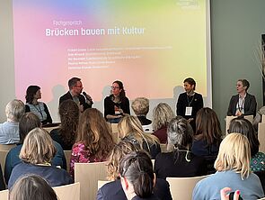 Das abschließende Panel resümiert die sechs Workshops der Landeskulturkonferenz. Den Workshop „Engagiert für Kultur“ fasst Frauke Lietz so zusammen: „Kultur ohne Ehrenamt – das wäre unvorstellbar. Gutes Engagement braucht jedoch auch gute Rahmenbedingungen.“ Sie weist Kulturschaffende auch auf die Mikroförderungen der Ehrenamtsstiftung hin.