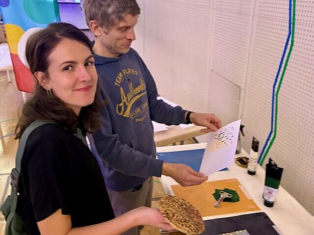 Über Kunst wird nicht nur gesprochen. Sie wird auf der Konferenz auch gezeigt. Zum Beispiel bei Sascha Steffen von der Kunstschule Neubrandenburg. Wer möchte, kann an seiner Pixelart-Station kleine Noppensteine zu Bildern zusammensetzen, mit Farbe bestreichen und auf Papier drucken. Judy Salewski hat es ausprobiert – und nimmt nun eine kunstvolle Erinnerung mit nach Hause.