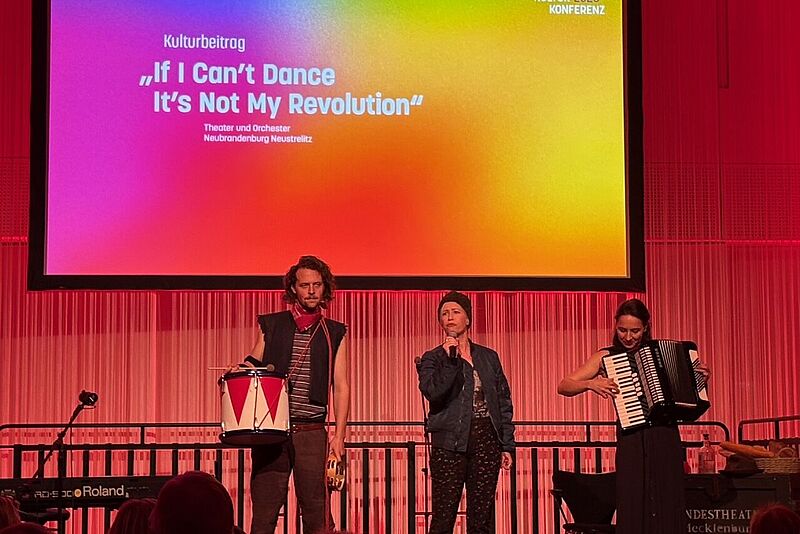 Los geht's. Susan Ihlenfeld, Josefin Ristau und Tim Tonndorf (Theater und Orchester GmbH Neubrandenburg/Neustrelitz) singen „Bella Ciao“ aus dem Programm „If I Can’t Dance It’s Not My Revolution.“