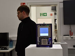 Die Luft trägt einen Hauch von Bit und Byte, eine verpixelte Aura, die von den 3D-Druckern und Gameboy-Platinen herrührt. Kolja Hohberg, gerade mit dem Studium fertig, blickt auf eine Entwicklung zurück, die ihn stetig tiefer in die eigene Formensprache geführt hat. Bereits bei einem seiner ersten Projekte „Keramik Skulpturale" arbeitet er mit Künstlicher Intelligenz als Spaaringspartner. Ein Mann aus Ton zwängt sich in verschiedene viel zu kleinen Räume.