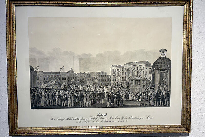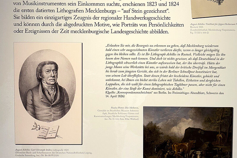 Der Rundgang im Obergeschoss des Kulturforums führt auch nach Warnemünde, Wismar, Bad Doberan und Güstrow. Und stellt ihn in den Mittelpunkt: August Achilles. Einen der ersten und wohl bekanntesten Lithografen Mecklenburgs. August Achilles wurde 1798 in Rostock geboren und erreichte seit den 1820er-Jahren ein großes Publikum: Durch seine sehr frühen Stadtansichten, zum Beispiel von Rostock, Doberan und Schwerin. Durch die Wiedergabe von Gemälden aus der großherzoglichen Kunstsammlung. Und die Abbildung historischer Ereignisse.
