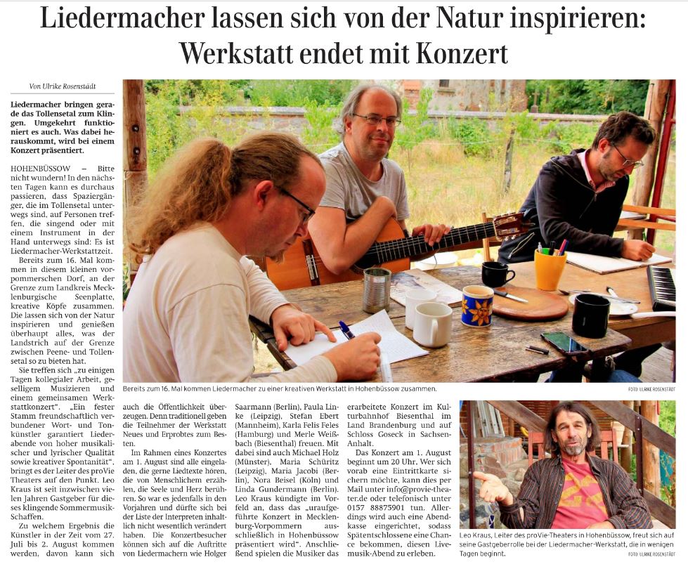 Zu einem Werkstatt-Konzert am 17.7., bei dem die Teilnehmer der Werkstatt Neues und Erprobtes aus ihrem Repertoire präsentieren, ist die Öffentlichkeit herzlich ins proVie-Theater Hohenbüssow eingeladen. Das Konzert beginnt um 20.00 Uhr. Bei gutem Wetter findet das Event auf dem Hof des proVie Theaters statt, bei schlechtem im Konzertsaal. Infos unter https://provie-theater.de/liedermacher-werkstatt-provie-theater/